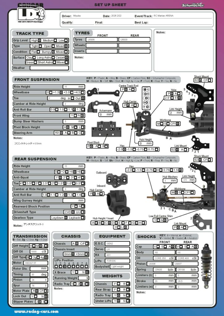 みゆか選手からも先日マニアックスアリーナ様で開催されました「ヨコモオフロードチャレンジカップ2026 in RC Maniax ARENA」でのセッティングシートを頂きました。2WDモデクラスでは予選2位/決勝4位、4WDモデクラスでは予選3位/決勝5位のリザルトでした。